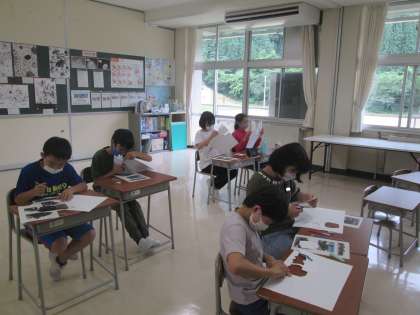5・6年生は、図画工作科の時間、宮沢賢治の「銀河鉄道の夜」の物語からイメージした列車を画用紙に描きました。スパッタリングの技法を多く取り入れることから、列車のシルエットだけを描いて切り取りました。切り取ったシルエットの大きさで全体のイメージが変わってくるので、大きさをよく考えながら描きました。