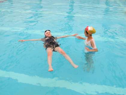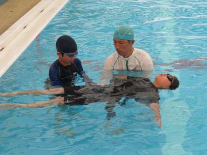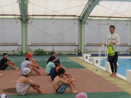 今日は、プールで「水辺の安全教室」を行いました。富山市役所市民生活部スポーツ健康課の方から、大の字になって水に浮く方法やペットボトルを使った浮き方などをご指導いただきました。ライフジャケットや衣服を着用する体験も行い、水から自分の身を守る方法を学びました。