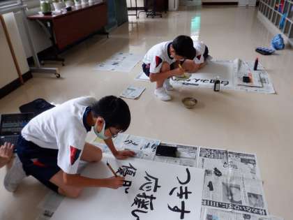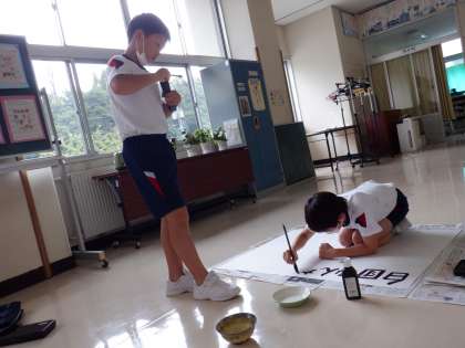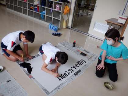当日、各団のスローガンやシンボルを掲示するため、真剣な表情で作成しています。