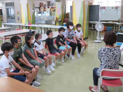 6年生がチャレンジ記録会に出かけたので、1〜5年生で読み聞かせを聞きました。