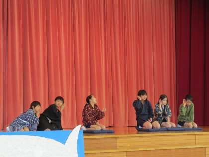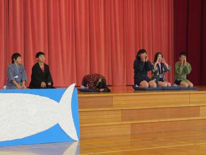 学習発表会5 全校発表(5・6年) 公開日 2022/10/29 更新日 2022/10/29 小見っ子ニュース 5・6年生は古典芸能の中から落語に挑戦!「まんじゅうこわい〜小見っ子バージョン〜」を披露しました。 身振り手振りでおもしろさを伝えました。