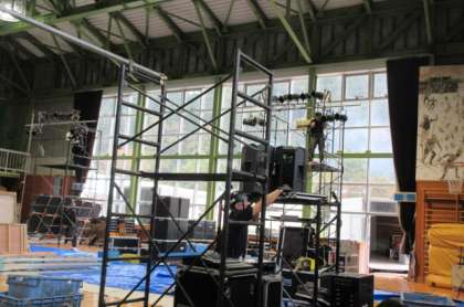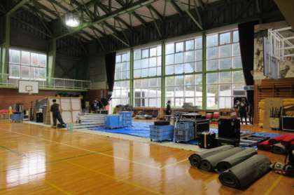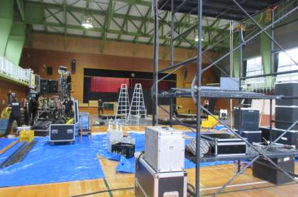 朝、大きなトラック2台が体育館に到着し、機材が運び込まれると、あっという間に体育館が劇場に変身しました。