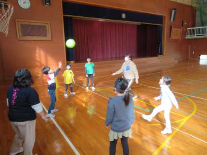1〜4年生でビーチバレーボールを使って、いろいろなパスをして遊びました。
