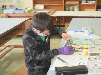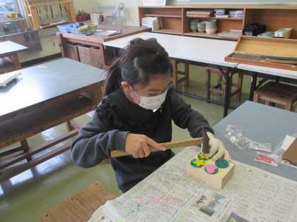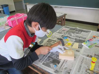 3・4年生は、図画工作科で「くぎうちトントン」という題材に取り組んでいます。板の組み合わせ方やくぎの打ち方を工夫します。3年生は初めてのくぎ打ちにドキドキしながら、慎重に作業を進めていました。