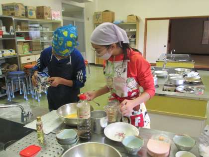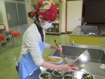 6年生は、家庭科で1食分の献立を考える学習をしています。今日は、栄養のバランスを考えた献立の中からおかず作りに挑戦しました。献立は「和風かに玉」と「ほうれん草の納豆チーズあえ」です。かにはカニ風味のかまぼこに変えたり、納豆和えのたれは納豆についてきた物を使わず、手作りしたりするなど工夫をしていました。