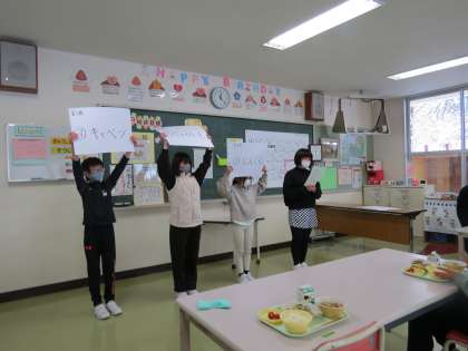 今日はすこやか委員会が考えた給食クイズをしました。赤・黄・緑の食品の働きや調理員さんの手洗い回数の問題を子供たちは真剣に考えていました。