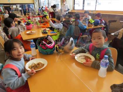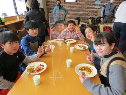 スキーでの交流を楽しんだ後は、レストランで昼食をいただきました。すっかり白馬北小の子供たちとも打ち解けて、会話を弾ませながら食事を楽しみました。