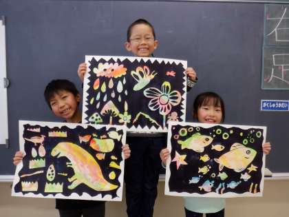 ローラーでかいた模様を生かしながら、自分のイメージした○○の世界を表現しました。