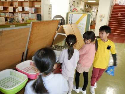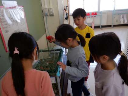 金魚のお世話の仕方や、歯みがきセットの置き方も丁寧に教える2年生です。