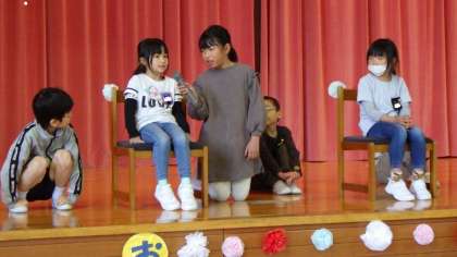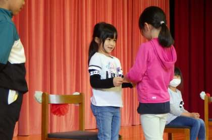 6年生と一緒に入場した1年生。3・4年生のインタビューに答えたり、2年生からプレゼントをもらったりしました。