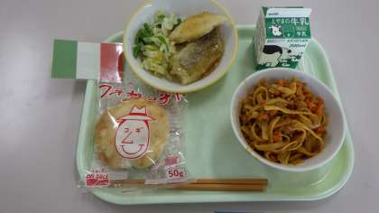 サミット給食の4回目は、イタリアの献立です。フォカッチャ、ホキのイタリアレモンソースかけ、グリーンアスパラのコントルノ、ラグー・アッラ・ボロネーゼが出ました。ホキにかかったレモンソースが爽やかな風味でした。