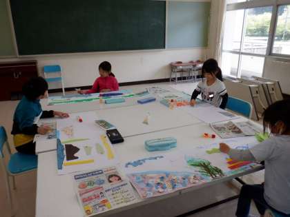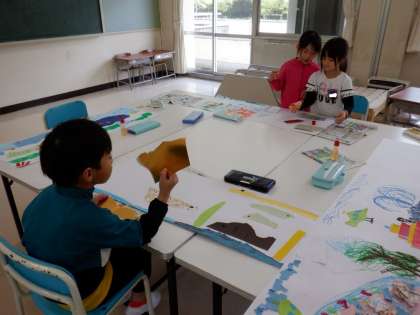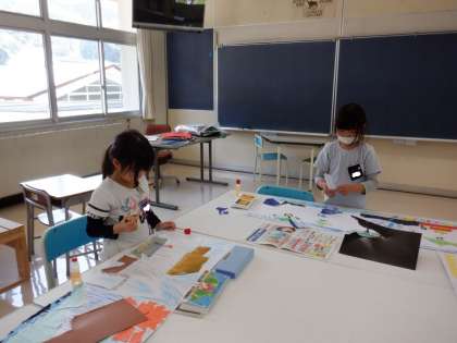 図工の時間に、破いた紙から発想を広げ、絵を描きました。破いた紙を回転させて、何に見えるかを友達と話しながら、活動を進めました。