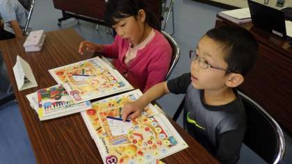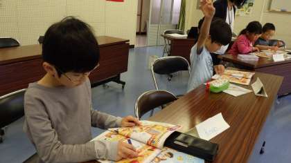 今日は、数を尋ねる英語表現を練習しました。最後は、教科書の中から「色」や「形」を探すゲームをしました。聞き取った形を素早く見つけられ、とてもうれしそうでした。