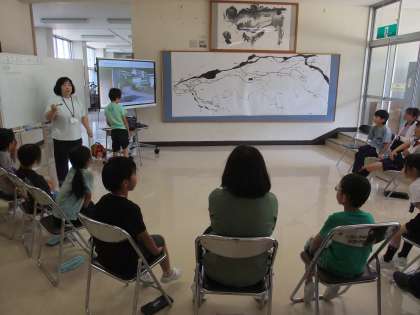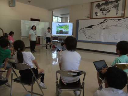 全校学習はこれで3回目です。今日は小見地区の地図を前に、今までに見つけた「小見のすてき」について、写真で紹介したり、地図で確認したりしました。「行ったことがないから行ってみたい」学びへの動機が生まれる授業になりました。