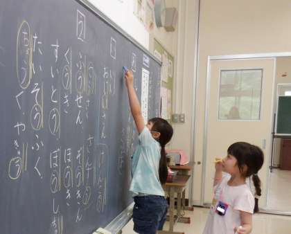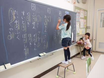 国語の時間に、「おばあさん」「ふうせん」のように、のばす音の入った言葉を見つける学習を行いました。2人でたしかめながら、たくさんの言葉を見つけました。
