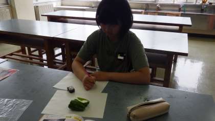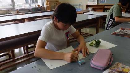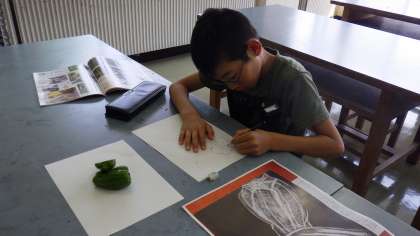 5・6年生は図画工作科で「消してかく」という題材に取り組んでいます。特殊な黒い用紙を砂消しゴムで削って白くして作品を仕上げていきます。まずは、ピーマンを写生しました。