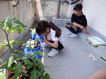 順調に成長している1年生のアサガオと2年生の野菜。ところが、観察していると、オクラの葉や茎に半透明の粒がいくつも。オクラに付く虫の卵かもしれないと心配になり、早速Chromebookで調べました。