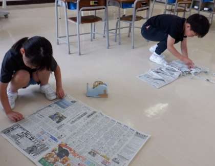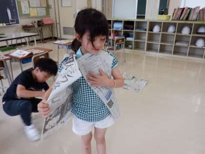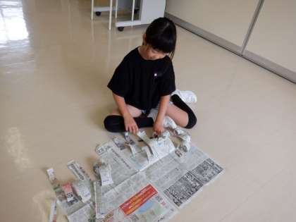 図工の時間に、新聞紙の感触を楽しみながら、思いついたものをつくる活動を行いました。破いたり丸めたり、服のように着てみたり・・・。楽しく活動しました。