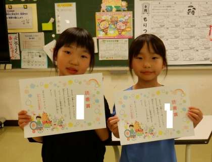 いろいろな本に親しみ、読書を楽しむことをねらいに取り組んでいる読書ビンゴ。Aコースのビンゴを達成した2名の表彰を行いました。これからも、楽しい本との出会いが待っていることでしょう。