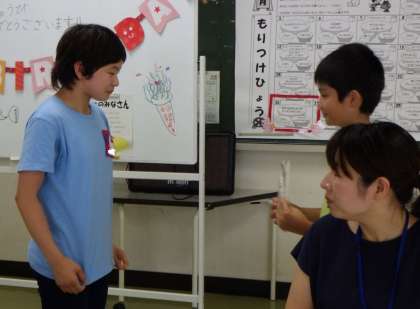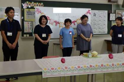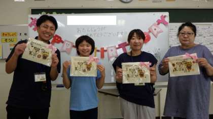 6・7月生まれのみなさんの誕生会食を行いました。元気もりもり委員会作成の手提げバッグのプレゼントに、にっこり笑顔が見られました。