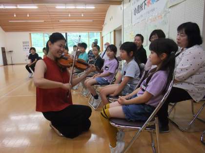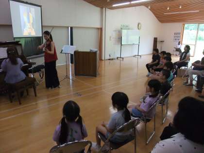 富山県文化振興財団の方々を招いて「学校コンサート」を行いました。ピアノとバイオリンでテンポよく様々な演奏を聴かせていただきました。