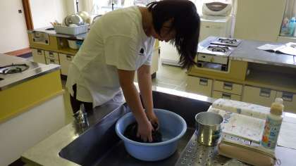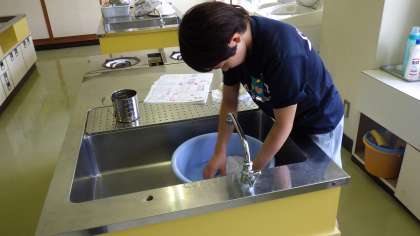 6年生は、家庭科の「夏をすずしくさわやかに」の学習で、Tシャツと靴下を手洗いしました。汚れを確かめたり、重さを量ったりした後、洗い・すすぎ、脱水を行いました。思ったより、水が汚れていることに驚いていました。