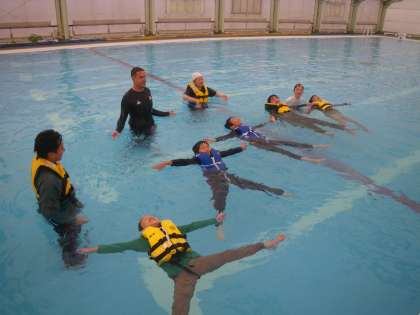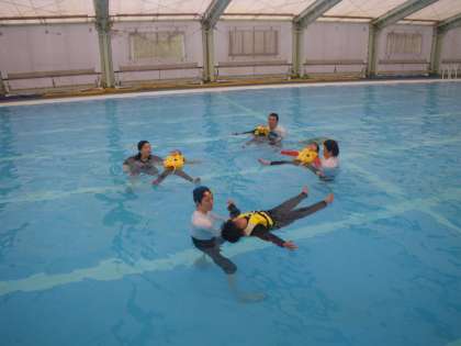 市スポーツ健康課と八尾B&G海洋センターから指導者を招いて「水辺の安全教室」を行いました。海や川などにおいて服を着たままで水の中に入ってしまったときに、自分の命を守るための浮き方について教わりました。