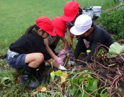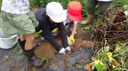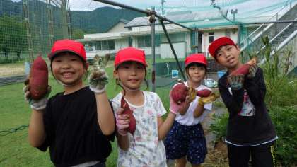 予想より大きなイモが収穫でき、笑顔いっぱいの1・2年生です。10月に入ったら、残りを収穫する予定です。