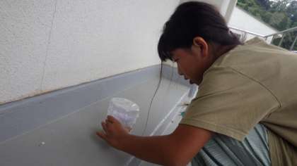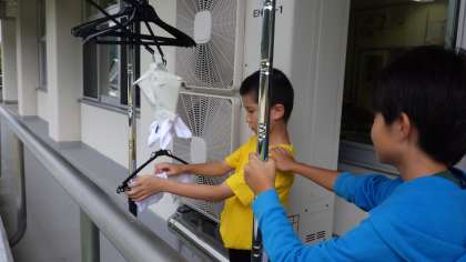 理科の学習で、ぬれたぞうきんを干すと軽くなるのはなぜかを調べています。ぞうきんに含まれている水が蒸発していると考えた子供たちは、それぞれ実験装置を考えて確かめました。