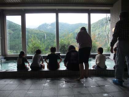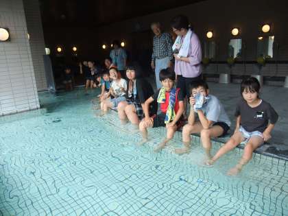 温泉を体験しました。みんなで足湯を堪能する小見っ子です。浴室から見る景色のすばらしさも味わうことができました。