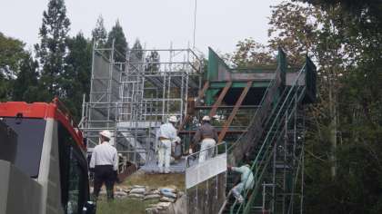 今日は、中間に増設されるスタートの骨組みと下の方のフェンスが付けられました。ふもとには、滑走面の鉄板が届いていました。