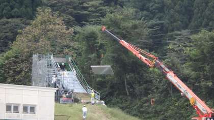 今日は、アプローチの部分の鉄板が取り付けられました。大きなクレーンで鉄板を指定の位置に移動させ、設置しておられました。新しいアプローチは、水が真ん中に集まって流れるようV字に雪止めがついています。