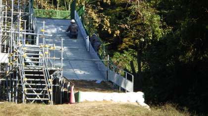 今日は、アプローチの横のフェンスが左右そろいました。今まで雪を留めてくれていた板の代わりにシルバーの網状の板が設置されました。雪が積もるところを想像しながら見ると、わくわくしてきます。
