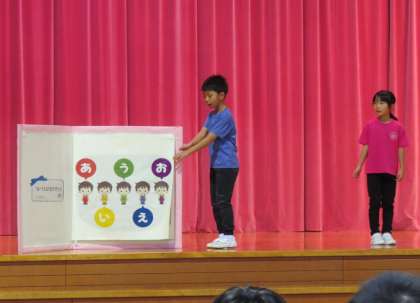 はじめは、教科書に出てくる「あいうえおであそぼう」を1・2年生がアレンジした小見っ子バージョンとして、発表しました。