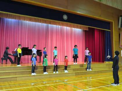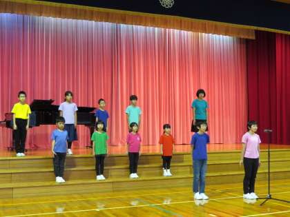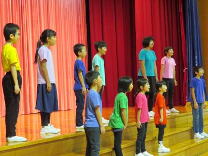 全校児童で、「小さな勇気」「歌が息をする」の2曲を合唱しました。最初に児童代表が、曲にまつわるエピソードを紹介した後、一人一人がそれぞれめあてをもって取り組んできた歌を披露しました。「笑顔で歌いたい」「歌詞の内容に合わせて、声の出し方や強弱を工夫したい」など、聴いてくださる方々に思いを届けようと、歌詞にもあるように心の炎を燃やし、思いを歌にのせて飛ばした小見っ子。みんなの歌声が一つになって、会場に響き渡りました。