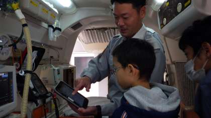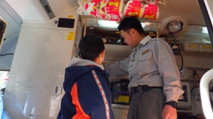 救急車の中には、AEDから酸素ボンベ、点滴、お産に必要な道具など、ありとあらゆる状況に対応ができるようになっていました。言葉が通じない外国人の人とも話せるタブレットもありました。