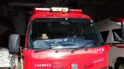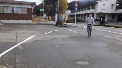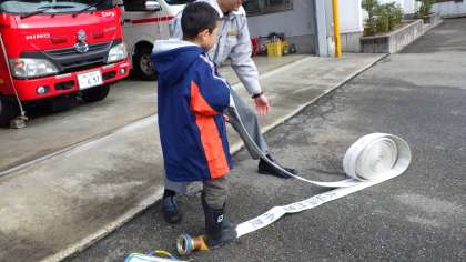 消防自動車に積んである20mホースを、実際に広げる体験をしました。ころころと転がり、一瞬で広がりました。