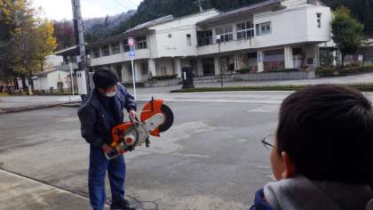 消防自動車の上についているケースについて質問をしたら、中身を出して見せてくださいました。エンジンカッターでした。とても大きな音に驚きました。これでシャッターなどを切り、建物の中に入っていくそうです。