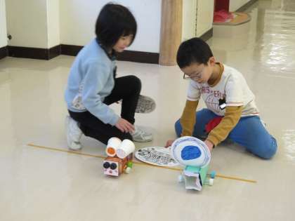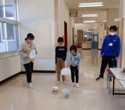 パタパタカーは、風受けがついた自動車をうちわであおいで走らせる遊びです。2台で競走するため、車選びも真剣です。レースの後は、メダルを首にかけて記念撮影をしました。