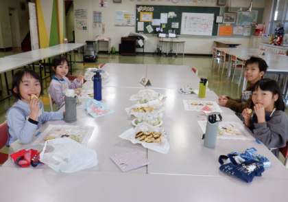 みんなでさつまいもクッキング その3(1・2年生) 公開日 2023/12/13 更新日 2023/12/13 1・2年生 できあがったクッキーと茶巾しぼりは、とてもおいしかったです。 職員室の先生方や上級生にも食べてもらいました。みんなが喜んでくれたので、1・2年生も笑顔いっぱいになりました。