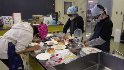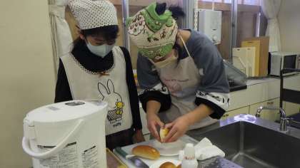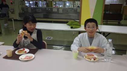今日は「チップバティー」というイギリスの軽食を作りました。パンに切れ目を入れてバターを塗り、フライドポテトをはさんだものです。クッキーの型で抜いたハムやチーズのトッピングも作りました。