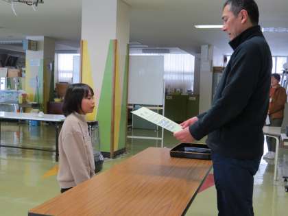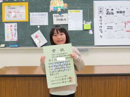 給食時に授賞伝達を行いました。富山県民体育大会スキー競技クロスカントリーで賞状をいただいた児童です。