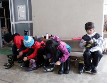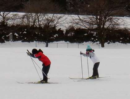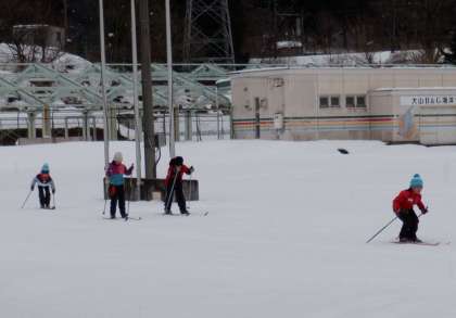 放課後の活動は、クロスカントリースキーです。スキー交歓会で楽しんでいる上級生と同じように、リレーや競走を楽しみました。
