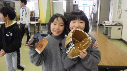 校長先生が、大谷選手から寄贈されたグローブを小見っ子に紹介しました。手にはめてみたり、実際にキャッチボールをしたりした子供たちの目は、きらきら輝いていました。