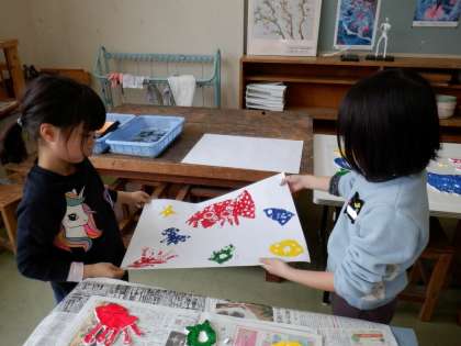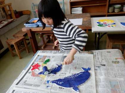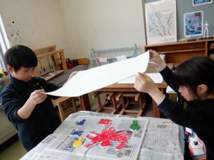 いよいよ版を刷ります。乾燥させてあった版にインクで色を塗り、並べたところに紙をのせます。友達と息を合わせて静かにのせました。どんな風に刷れたか、ドキドキしながら紙を外しました。「模様がうまく写ったね。」「イルカがジャンプしているみたい。」と、できばえに満足していました。