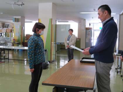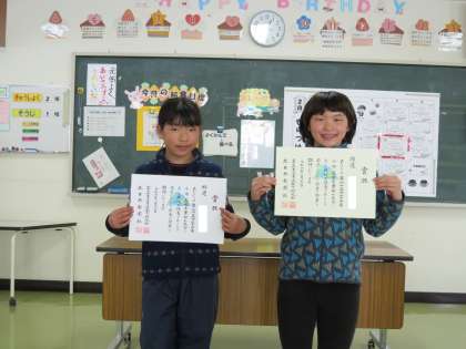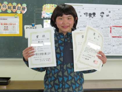 給食時に授賞伝達を行いました。グランドチャンピオンスイムミート2024、第25回富山チビッコ水泳大会、第65回富山県小・中・高校生書初大会で賞状をいただいた児童です。