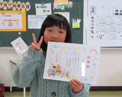 読書ビンゴSコースを達成した1年生の表彰を行いました。