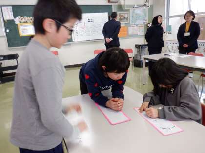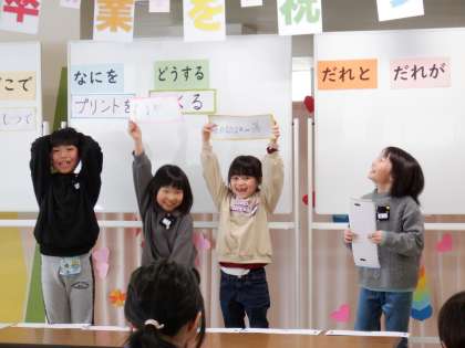 午後から卒業を祝う会がありました。6年生の入場の後は、学級ごとの出し物です。1・2年生は、文作りゲームをしました。チームに分かれて考えた言葉を組み合わせると、面白い文がたくさんできました。みんなで楽しく盛り上がりました!!