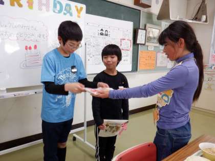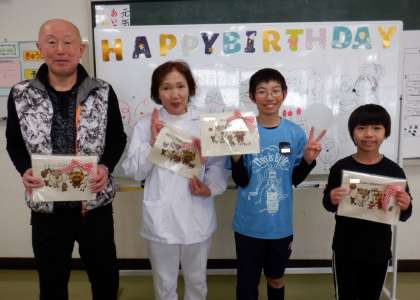3月生まれの小見っ子と職員をお祝いする誕生会食を行いました。全校から歌のプレゼント、そして、元気もりもり委員会から手作りバッグをプレゼントしました。3月生まれみなさんの笑顔がとてもすてきな会食でした。
