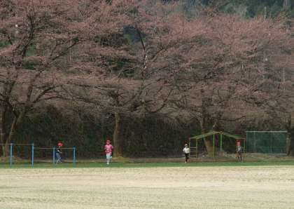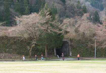 小見っ子の伝統、朝マラソンが始まりました。少し春色になったグラウンドの桜を背景に、運動で体と心を鍛える小見っ子です。